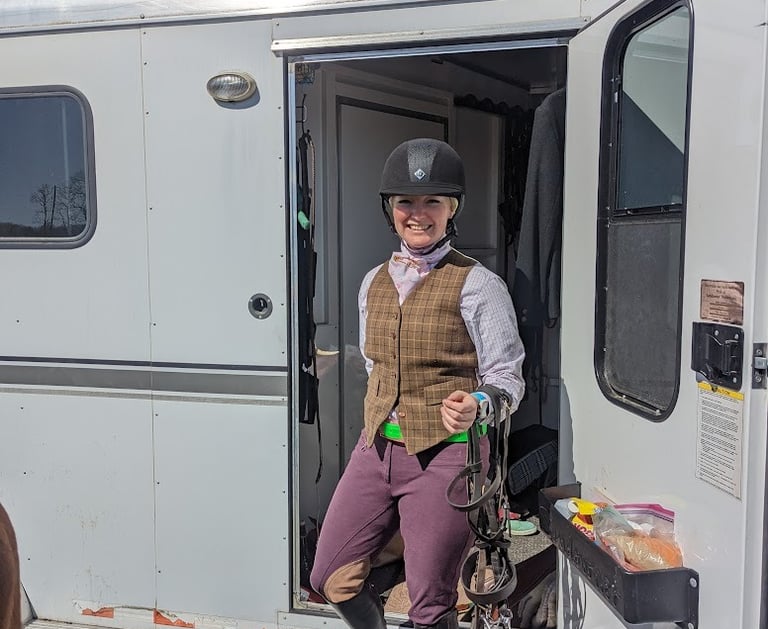 Breeches: Light-colored breeches (cream or tan) made from a durable fabric.